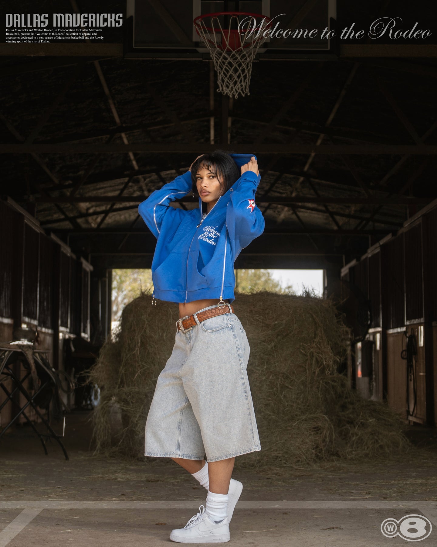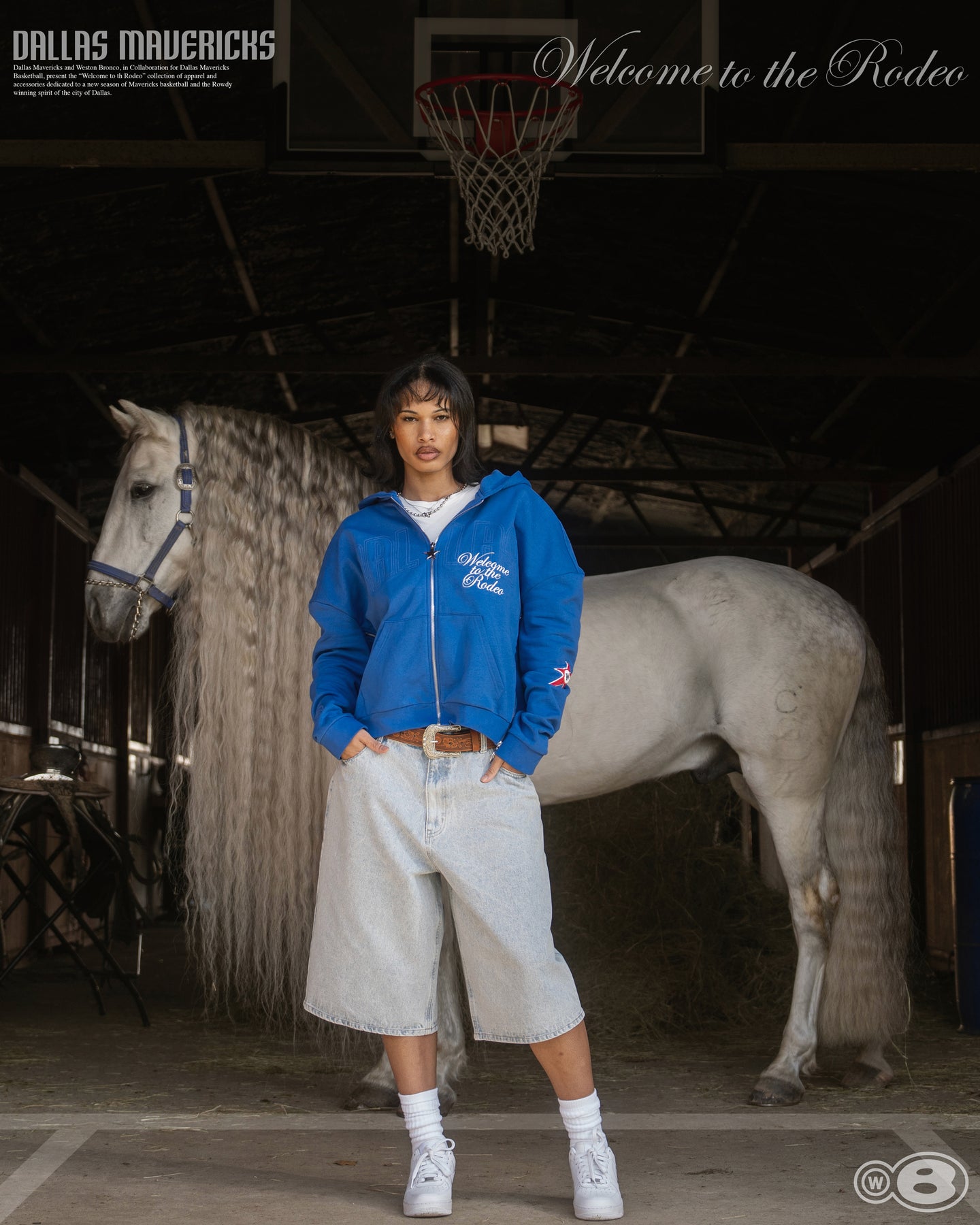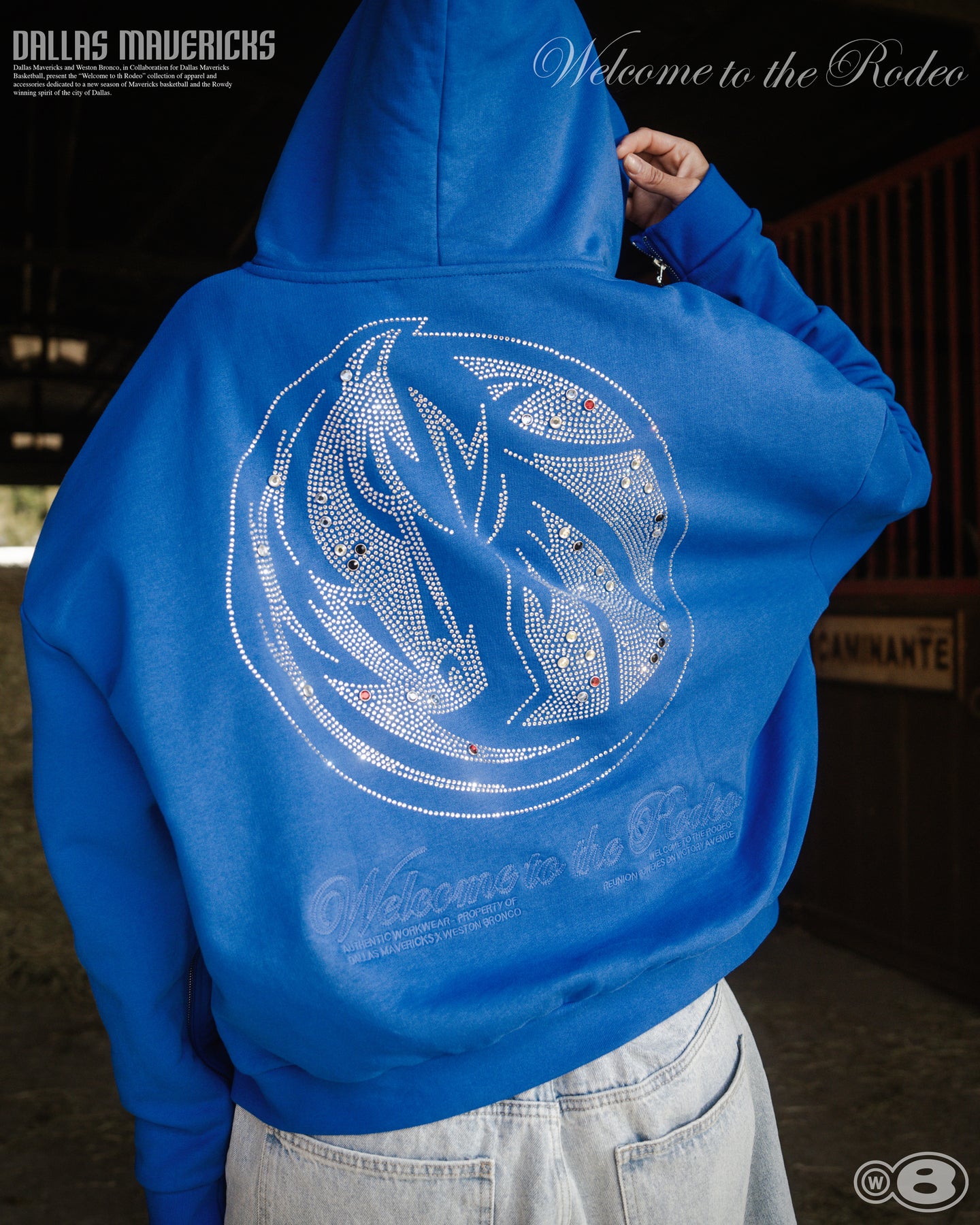 Dallas Mavericks x Weston Bronco collab Hoodie. Embroidered ront and sleeve details. Rhinestone applique and chain embroidery rear details.